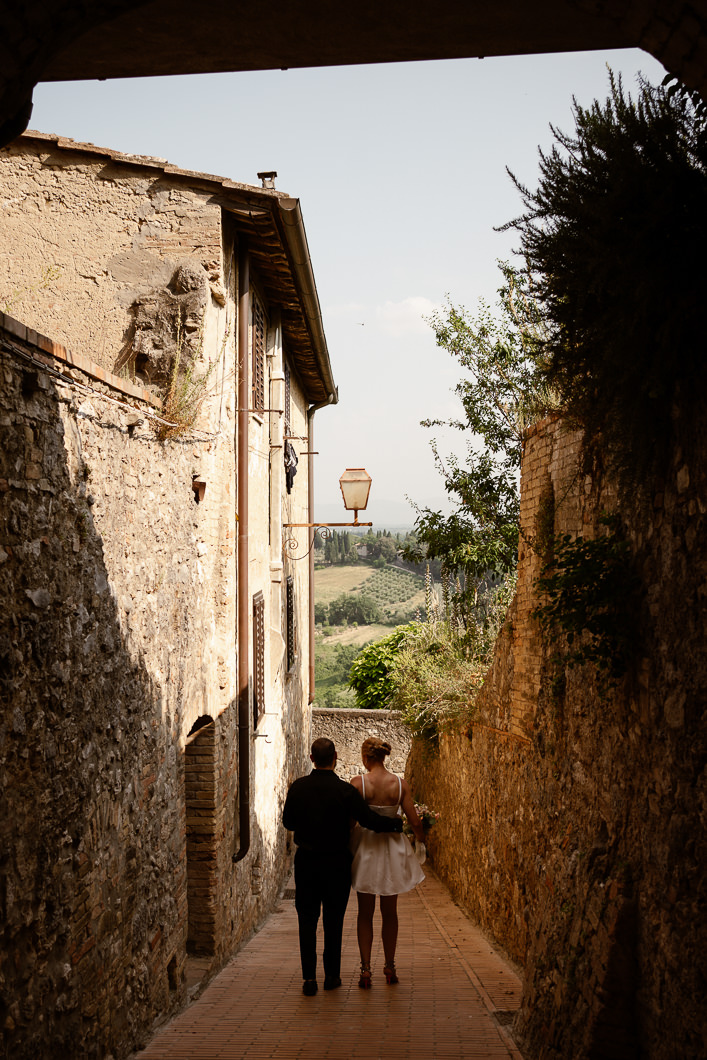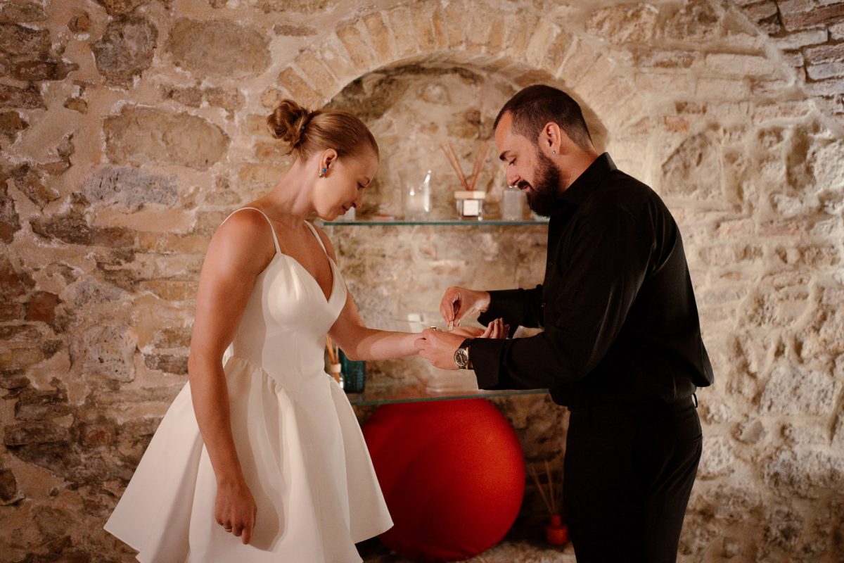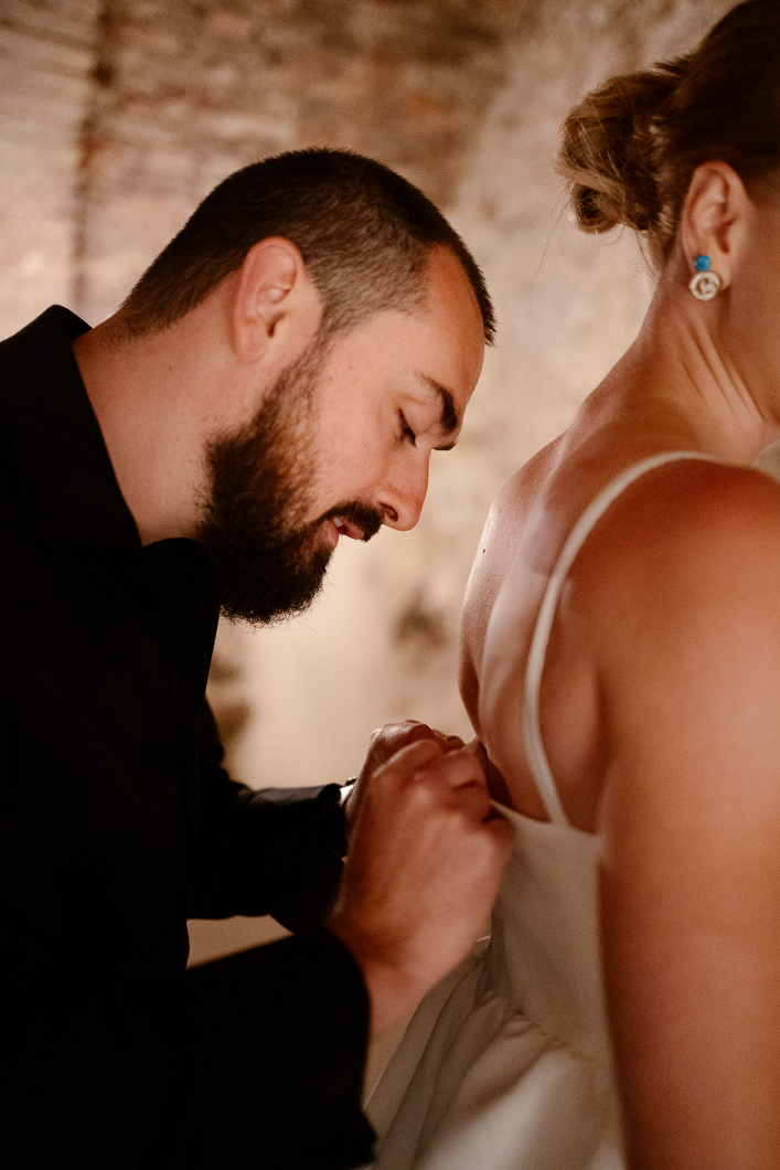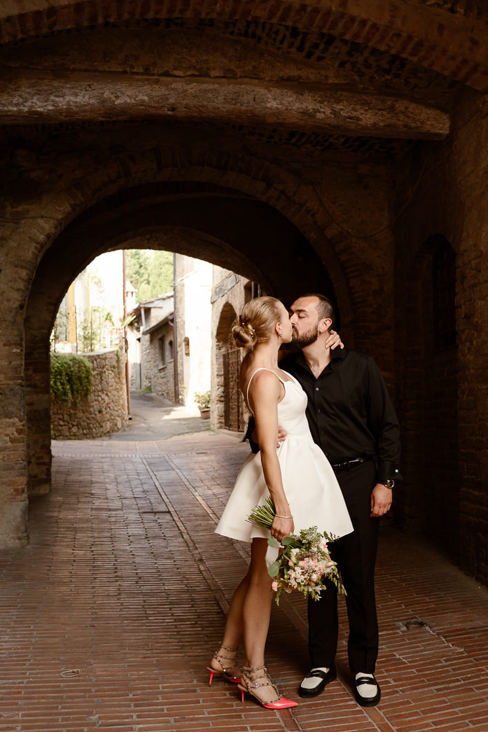 This lovely couple dreamed of a quiet and authentic Tuscany elopement, surrounded only by nature, golden light, and the emotions of the moment. They chose to stay in a beautiful apartment in San Gimignano, getting ready together inside an ancient stone room full of history and timeless atmosphere — the perfect beginning for an intimate elopement in Tuscany.
