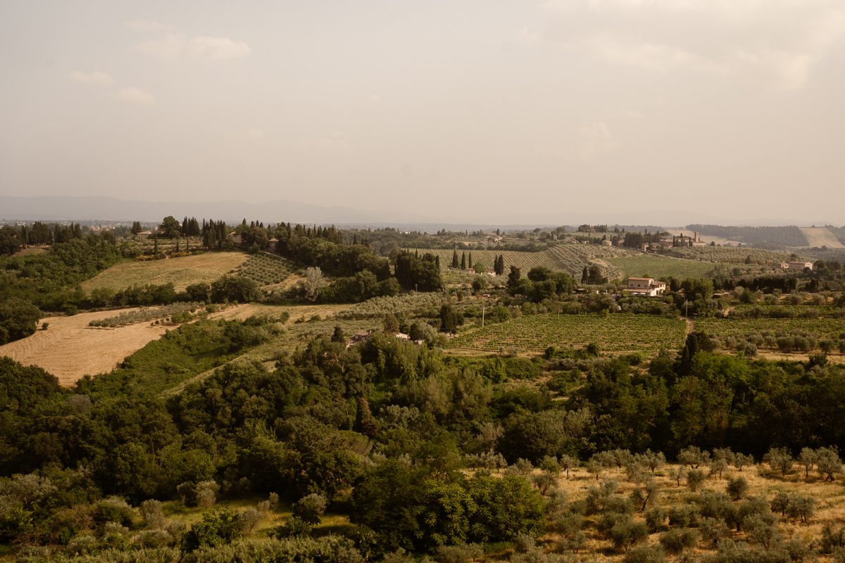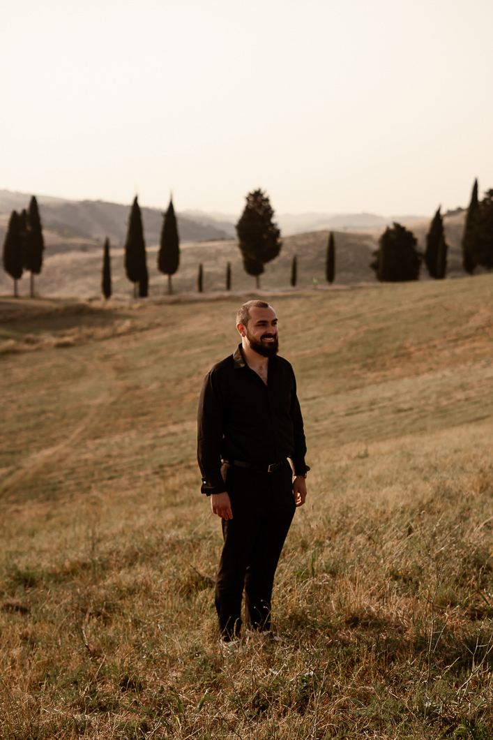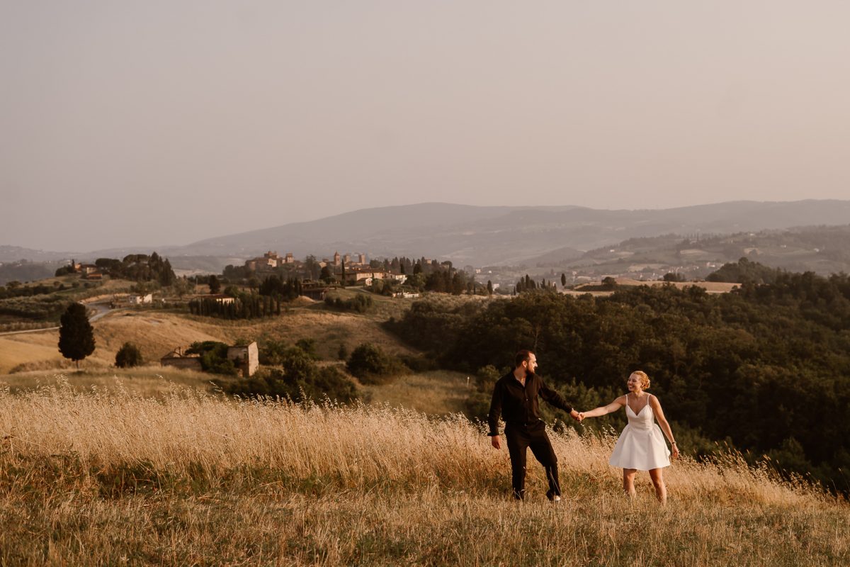 We then enjoyed a peaceful walk through the historic streets of San Gimignano, creating natural memories before reaching a hidden panoramic park on a hill near Certaldo, one of the most beautiful and intimate locations for an outdoor ceremony in Tuscany. As the sun slowly set over the Tuscan countryside and the cypress trees stood quietly around them, the space felt private, calm, and sacred.