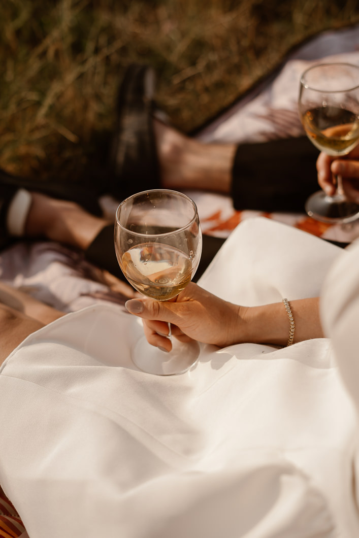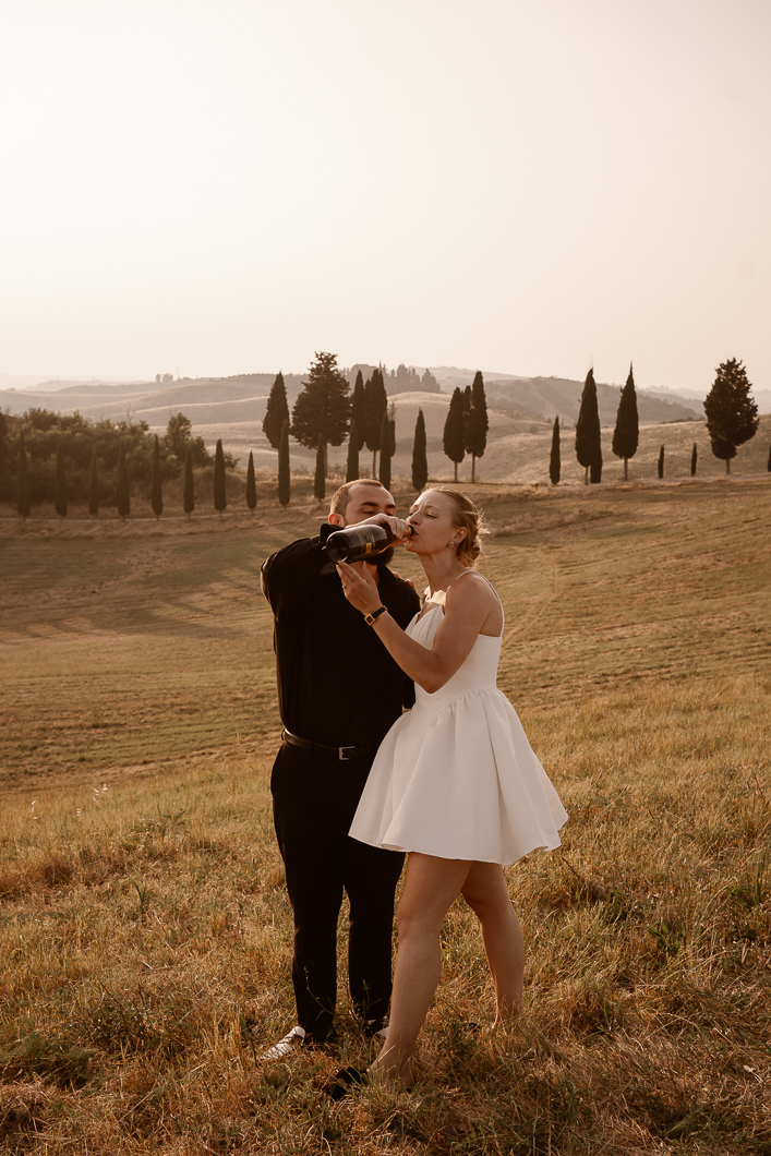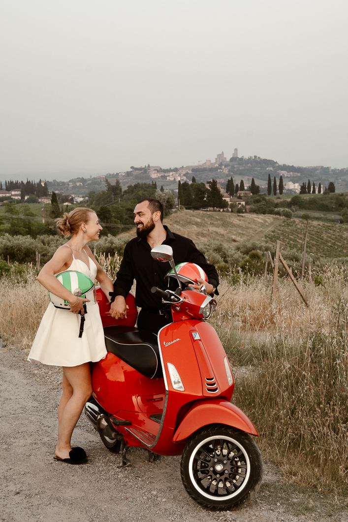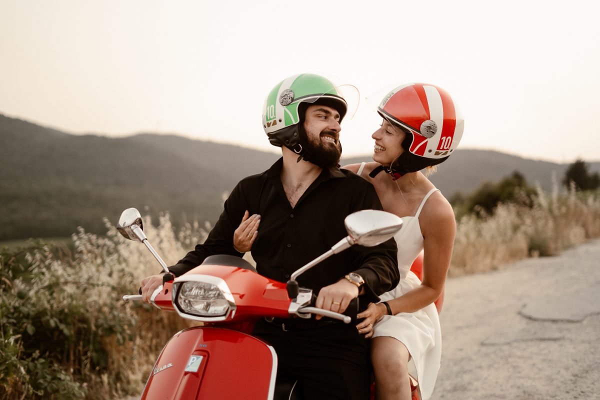 After the ceremony, they celebrated with prosecco on a simple blanket, relaxed in the silence of the hills, and ended the day with joyful and romantic portraits, including an iconic ride on an Italian Vespa through the Tuscan landscape.
